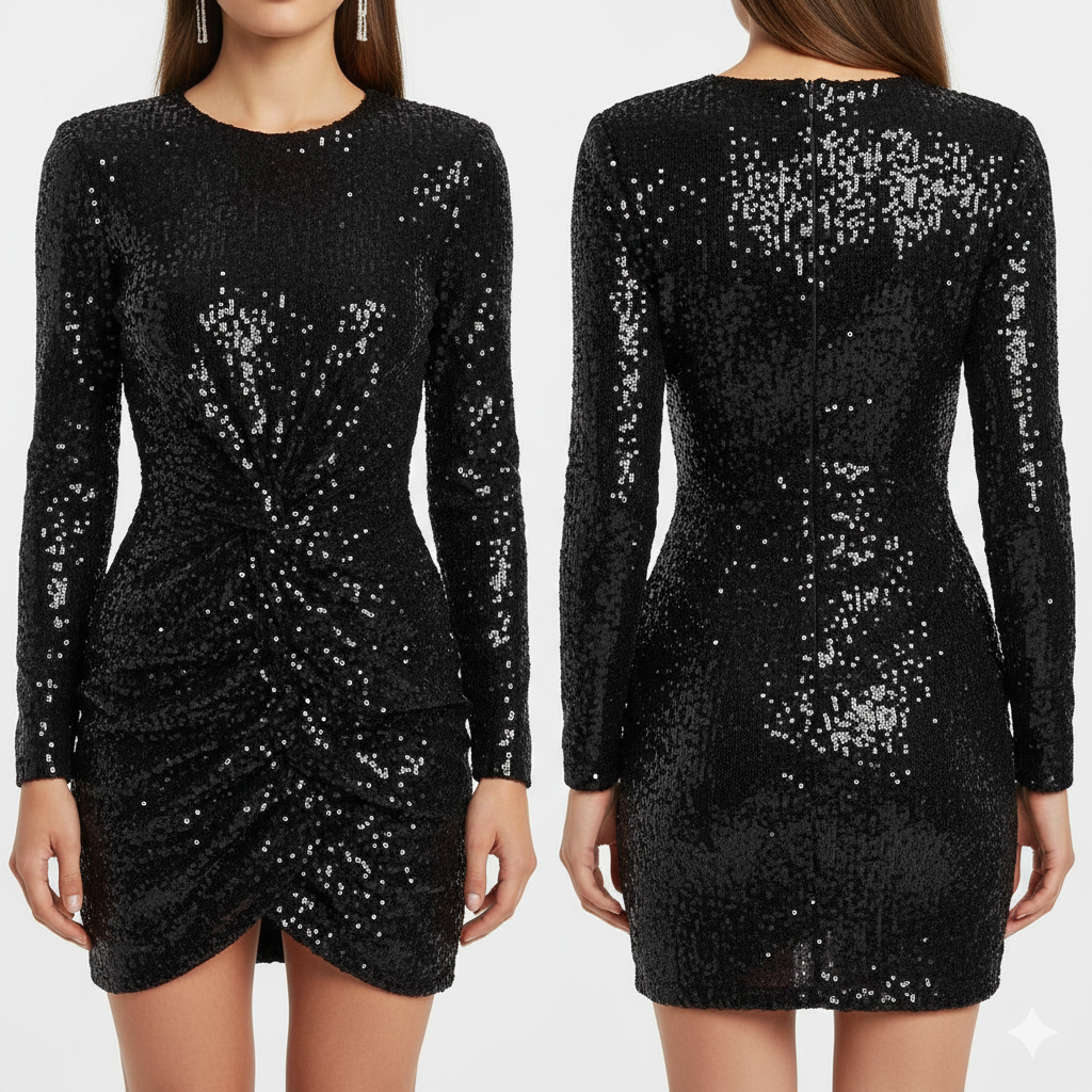 Das Mara Damenkleid besticht durch luxuriöse schwarze Pailletten, die bei jeder Bewegung das Licht einfangen und so eine glamouröse Ausstrahlung verleihen. Das elegante Twist-Detail an der Vorderseite erzeugt ein schmeichelndes Drapé, das die Taille betont und eine feminine, figurumspielende Silhouette zaubert. Mit langen Ärmeln bietet das Kleid optimalen Tragekomfort und ist für verschiedene Anlässe sowie Jahreszeiten gleichermaßen geeignet. Die Kombination aus stilvoller Eleganz und hochwertiger Verarbeitung macht das Kleid zum perfekten Begleiter für festliche Events.