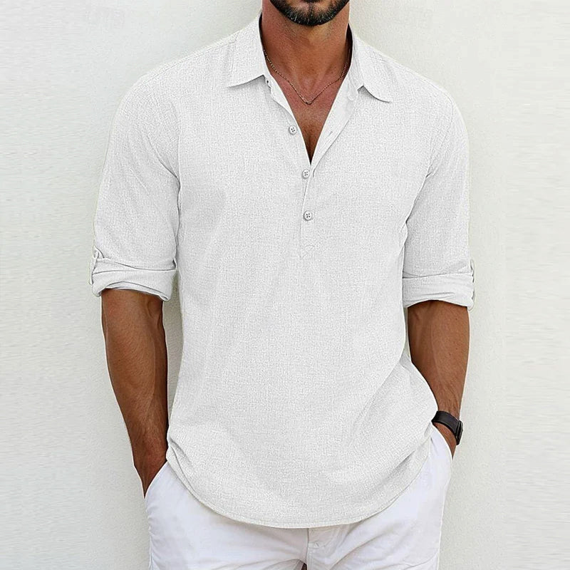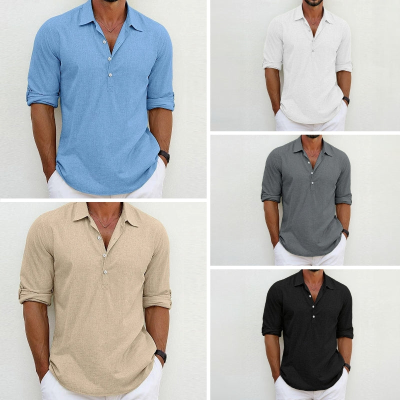 Dieses Langarm-Wunder vereint mühelose Eleganz mit alltäglichem Komfort, perfekt für jede Gelegenheit. Die halbe Knopfleiste verleiht einen Hauch von modernem Flair, während der klassische Umlegekragen zeitlose Raffinesse ausstrahlt.